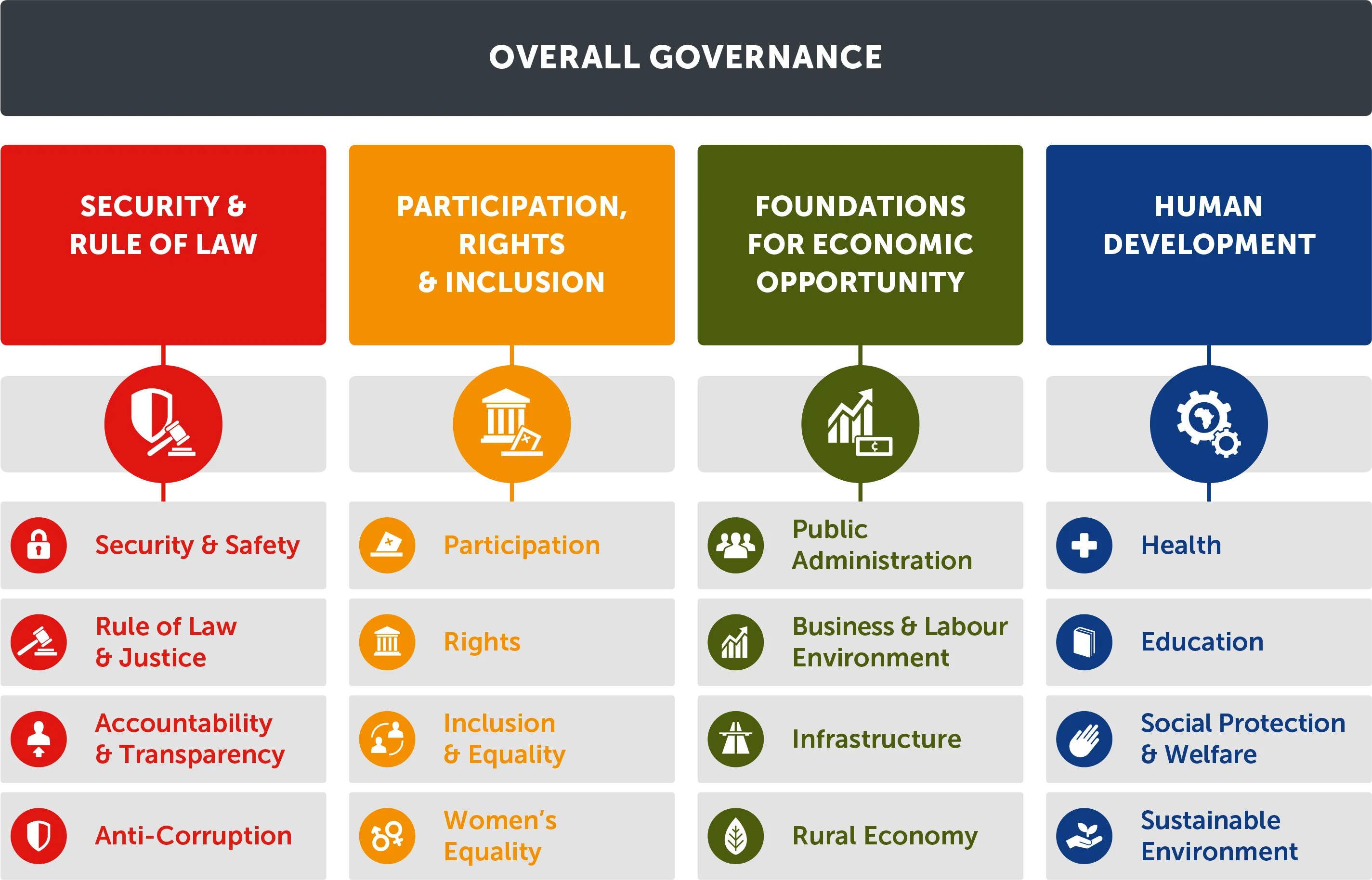 The IIAG constitutes the most comprehensive dataset measuring African governance, providing specific scores and trends at African continental, regional, and national level, on a whole spectrum of thematic governance dimensions, from security to justice to rights and economic opportunity to health.